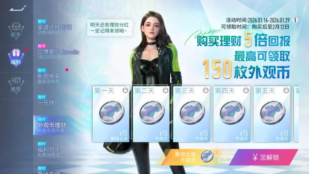 外观币理财来了!1月16日~1月29日,活动期间,购买理财得5倍回报,车手们一共可领取150枚外观币,超值理财不容错过!