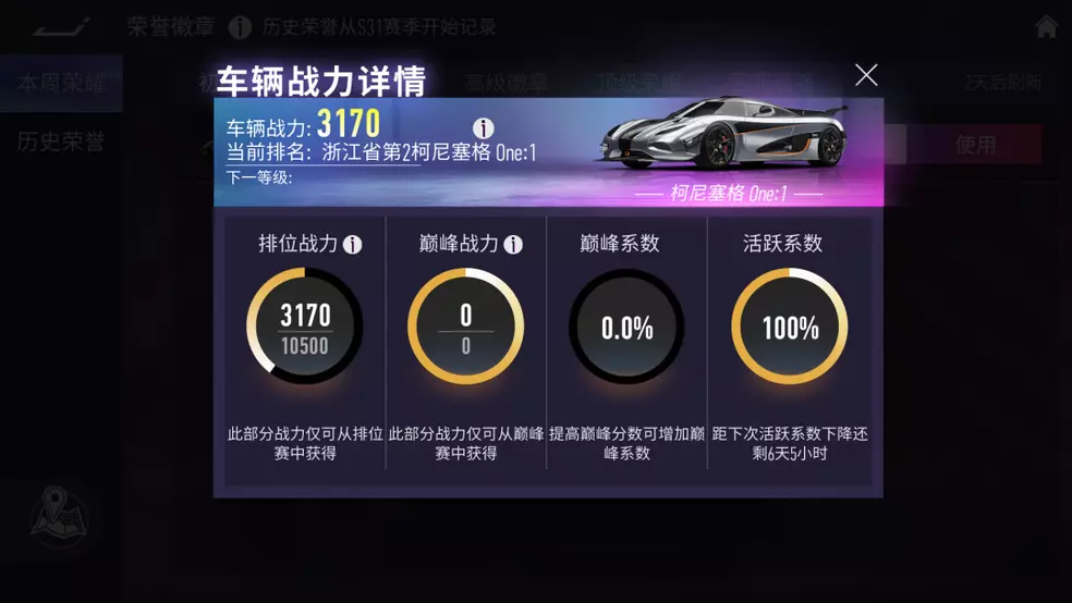 用于判断车手们是否在频繁使用该车辆,超过7天未使用车辆参与排位/巅峰赛时,活跃系数将会自动衰减(再次活跃后即可恢复)