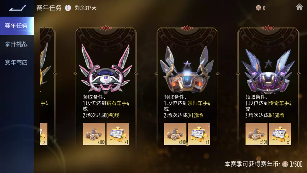 车手们可以在每个赛季完成指定任务以获得赛年币,并通过赛年币兑换珍稀道具奖励(如赛年专属限定涂装),赛年币的获取共有两种方式: