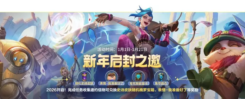 截止至1月21日23:59,召唤师通过完成活动任务收集“邀约信物”,可以兑换史诗皮肤随机魄罗宝箱、表情-我准备好了、海克斯能量卡等奖励~