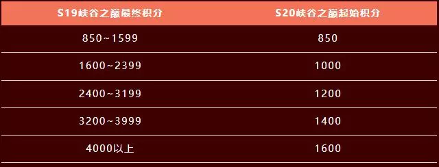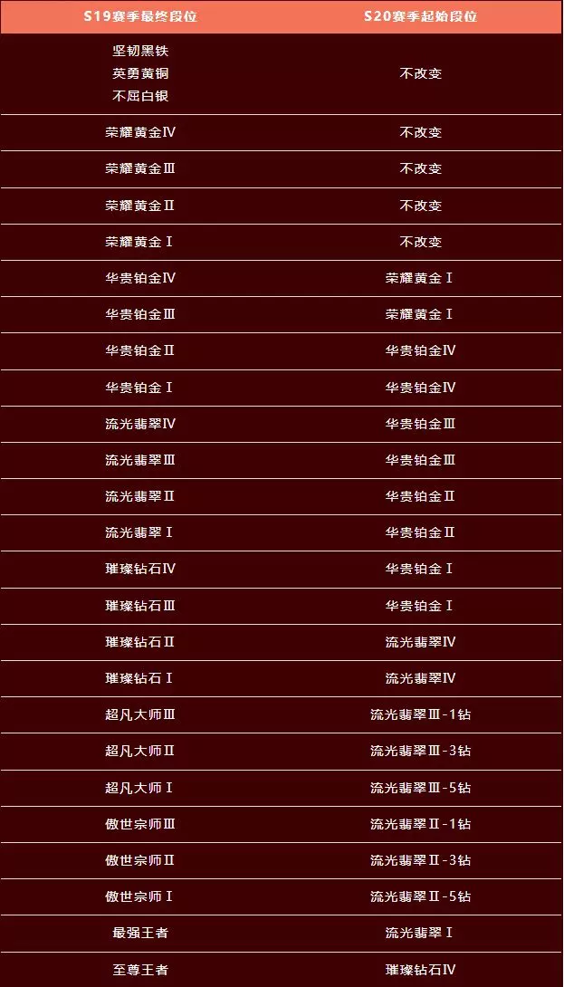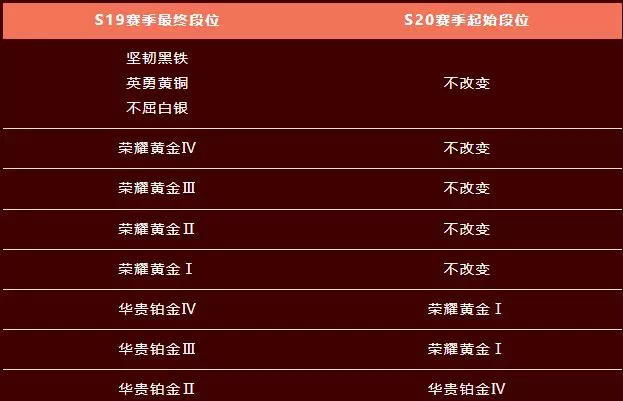 新赛季的起始段位将取决于S19赛季结束时的最终段位,详情如下: