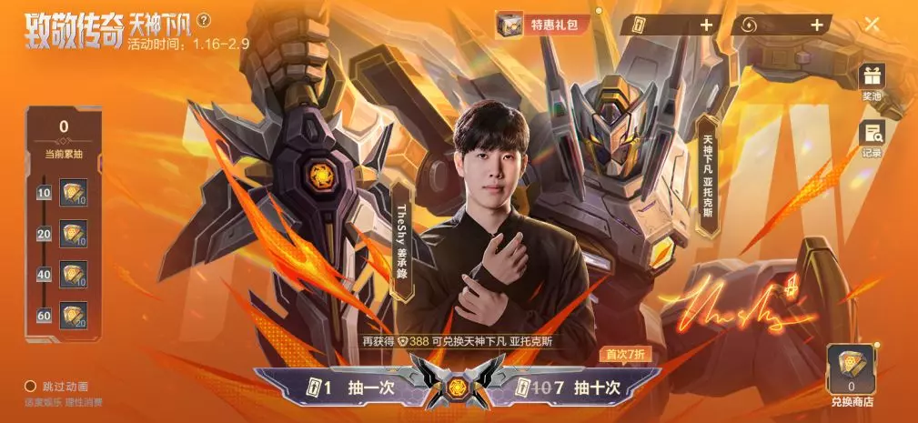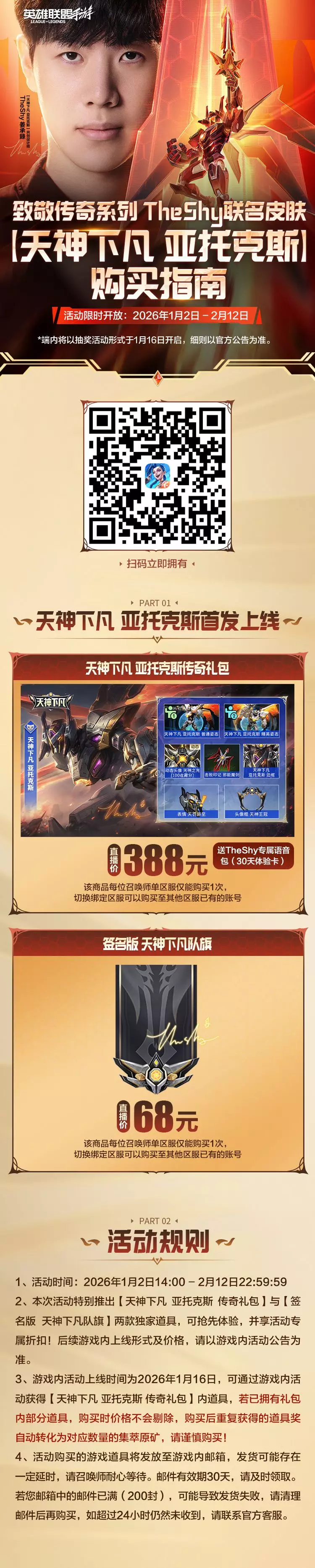 截止至2月12日,召唤师可前往《英雄联盟手游》抖音官方直播间、抖音《英雄联盟手游》官方旗舰店购买【天神下凡 亚托克斯】传奇礼包以及签名版 天神下凡队旗,除了享受限时惊爆折扣,还能抽TheShy实体周边、企鹅币、手办等好礼!