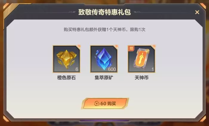 1月16日(明日)-2月9日活动期间,花费60点券即可购买特惠礼包,限购1次,礼包包含天神币*1、橙色原石*6、集萃原矿*600。