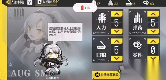 二、人形制造秘籍 1.使用系统推荐公式直接制造,方便快捷。 2.手动输入特定公式,制造特定类型的战术人形。 希拉的提示:可以注意一下协助者的气泡文字哦!听说会告诉你特殊的公式~ 总的来说,其实多打几把收集资源,然后自动推荐制造就可以了~