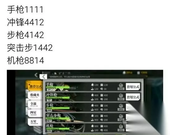 三、人形制造公式: 1、人形制造公式:冲锋4412、步枪4142、突击1442、机枪5514、霰弹5154。霰弹枪5555、狙击枪4142、冲锋枪4412、突击步枪1442、机枪5514。 2、顺带一提,如果缺资源,去上变异pve,开个人无尽,进去秒退,不出意外i啊,十五分钟四十个,按照我上面的公式来,开启五连抽,基本上很快就齐了。