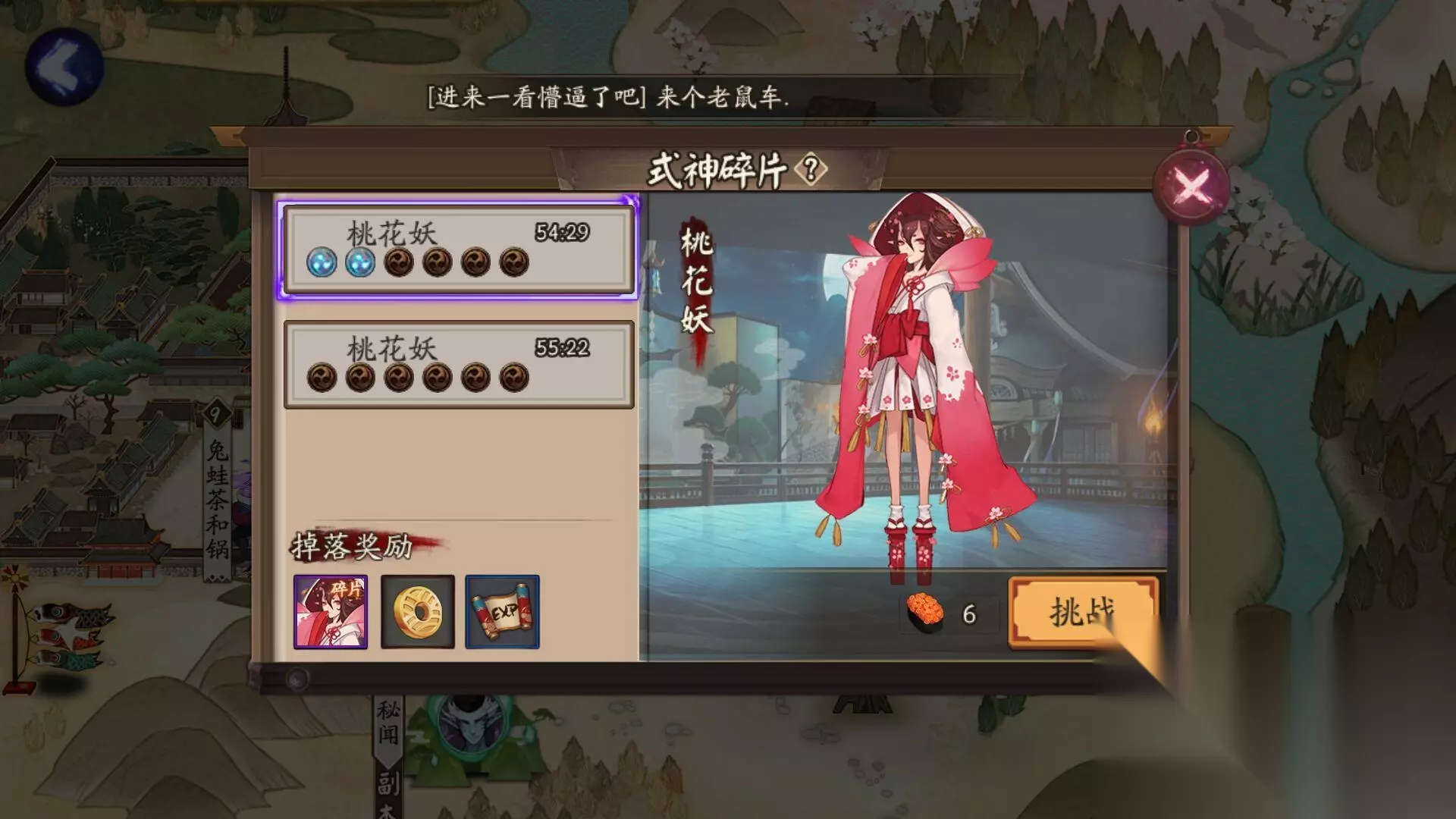 非洲人,连莹草都抽不到,更何况惠比寿、花鸟卷什么的了,打本有时候真的非常非常需要一个奶啊!这里给和我一样脸黑的萌新介绍一个体力刷桃花妖的方法,虽然桃花妖有点吃御魂,前期不太好用,但好歹是个奶呀! 方法一:式神挑战。 探索副本第八章会发现妖怪桃花妖,使用式神挑战券可以发起挑战得到桃花妖碎片。如果运气好就可以触发式神碎片本,也就是我们的主要碎片来源!