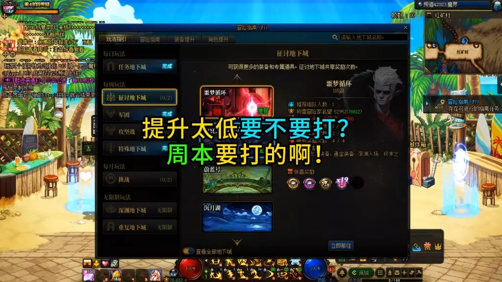这篇帖子分享DNF重力之泉版本征讨地下城周本小技巧,介绍了5个115级高级本的门槛、产出,推荐打最高名望副本,还讲解沉月湖等副本的机制,推荐组队带奶通关。