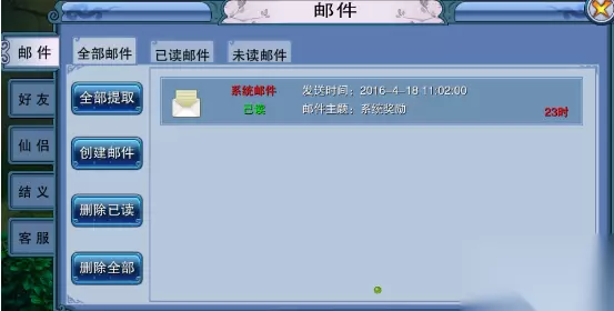 邮件系统介绍 1、邮件分为全部邮件、未读邮件、已读邮件三类。 2、在创建邮件时,可点击收件人旁的好友图标,在好友列表中快速寻找收件人。
