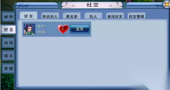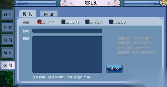 好友系统介绍 1、好友界面分为好友、陌生人、黑名单、查找好友、好友管理5个选项卡。 2、在好友选项卡中,玩家可看到自己的好友。并且点击好友头像可在弹出菜单中选择各种操作。 3、查找好友选项卡中分为好友推送和查找好友。好友推送中系统会随机向玩家推荐好友;好友查找中玩家可以根据对方角色名添加好友。 4、好友管理选项卡中,可对自己的好友进行批量操作。 三、客服 玩家可以在客服界面向客服提交游戏中遇到的BUG、建议等。并且可以收到客服的即时回复。