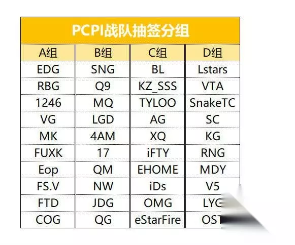 A组:EDG RBG 1246 VG MK FUXK Eop FS.V FTD COG B组:SNG Q9 MQ LGD 4AM 17 QM NW JDG QG C组:BL KZ_SSS TYLOO AG XQ iFTY EHOME iDs OMG eStarFire D组:Lstars VTA SnakeTC SC KG RNG MDY V5 LYG OST
