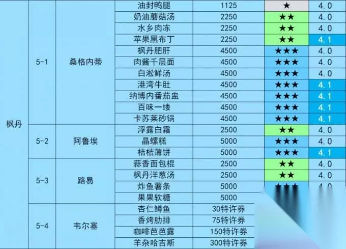 五国截止4.1目前共统计19位食谱商人,合计97种在售食谱。 食谱商人及在售食谱一览