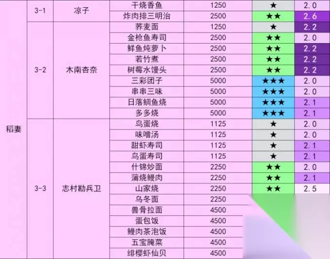 3-2 木南杏奈 稻妻城小吃店 出售食谱9个:荞麦面、金枪鱼寿司、鲜鱼炖萝卜、若竹煮、树莓水馒头、三彩团子、串串三味、日落鲷鱼烧、多多烧