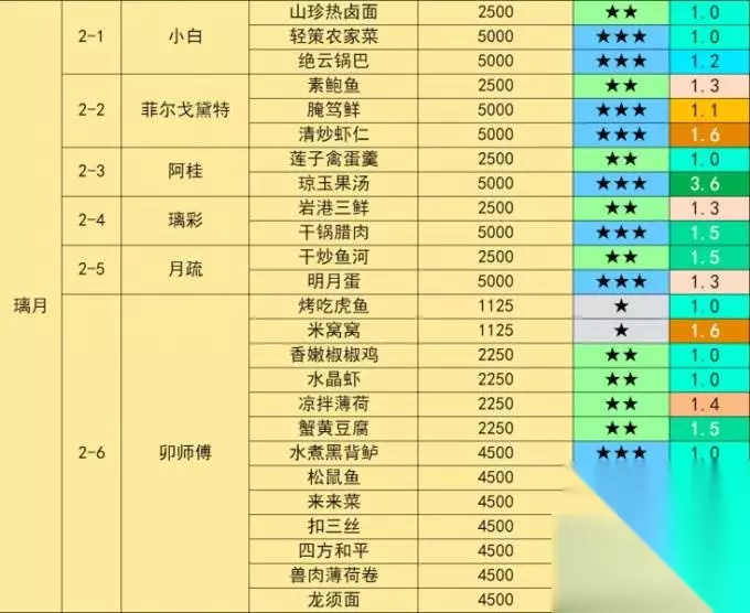 2-6 卯师傅 璃月港-万民堂 出售食谱13个:烤吃虎鱼、米窝窝、香嫩椒椒鸡、水晶虾、凉拌薄荷、蟹黄豆腐、水煮黑背鲈、松鼠鱼、来来菜、扣三丝、四方和平、兽肉薄荷卷、龙须面