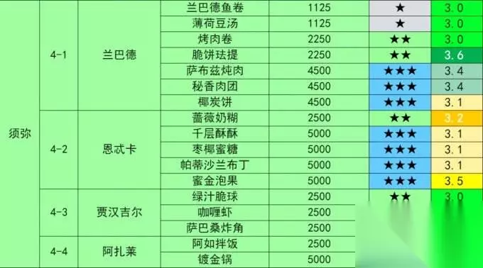 4-1 兰巴德 须弥城-兰巴德酒馆 出售食谱7个:兰巴德鱼卷、薄荷豆汤、烤肉卷、椰炭饼、萨布兹炖肉、秘香肉团、脆饼珐提