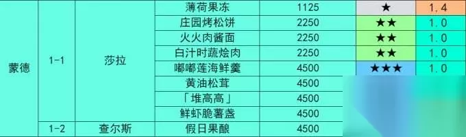 1-1 莎拉 蒙德城-猎鹿人餐馆前台 出售食谱8个:薄荷果冻、庄园烤松饼、火火肉酱面、白汁时蔬烩肉、嘟嘟莲海鲜羹、黄油松茸、「堆高高」、鲜虾脆薯盏
