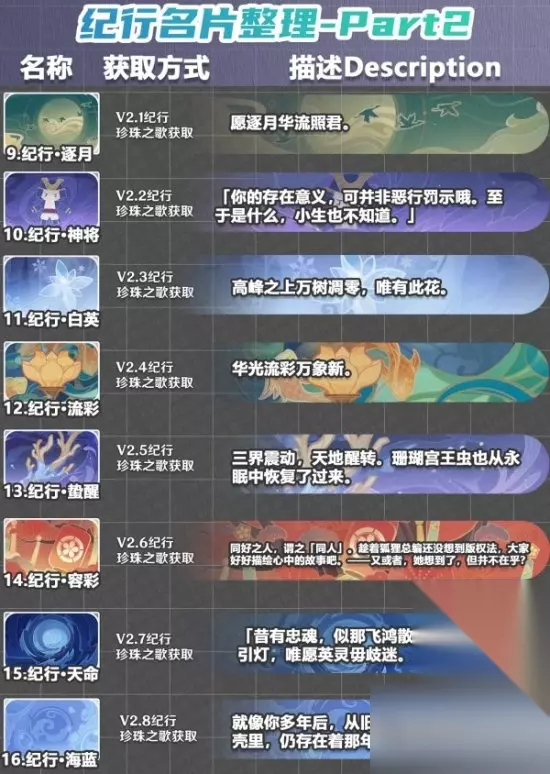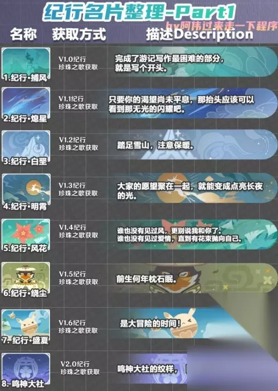 《原神》绝版限定名片图鉴及获取方式一览 一、表格说明 各名片的获取方式已标注,庆典一栏是全部绝版了,纪行还可以在3.8版本结束前获取一张。 庆典系列名片不会出现在名片图鉴里,如果你没有获取那么游戏内是找不着的。 庆典第十一张名片本来好像是作为周年庆礼包氪金获取的,但最后废除了。 二、名片大全