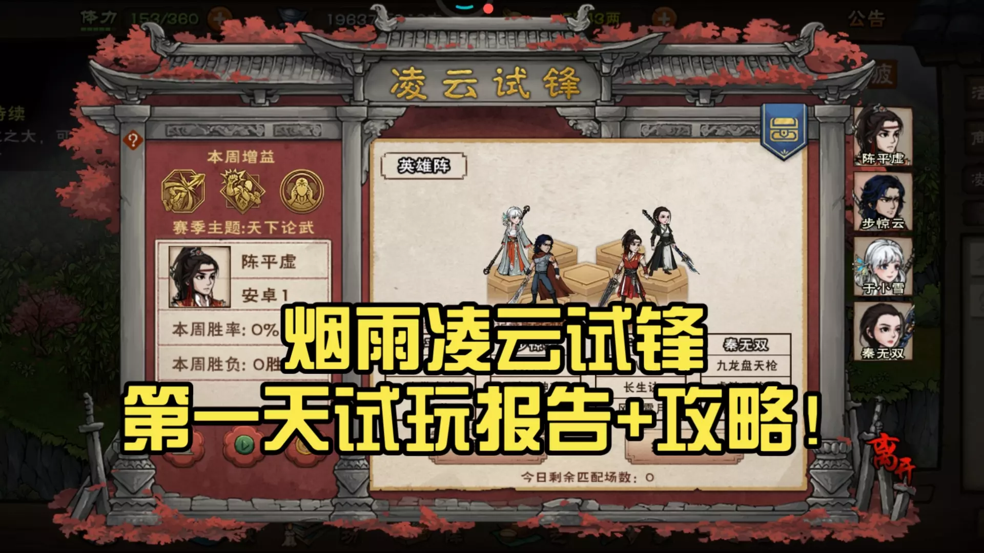 这是手游《烟雨江湖》凌云试锋玩法解析,该玩法要求玩家等级≥90级、武道登峰造极,玩家可刷新选择伙伴、挑选四组套路装备构建战斗体系,选择后不可更改,每周有刷新次数限制,活动持续一月含4轮周赛,每日可进行3场匹配赛。