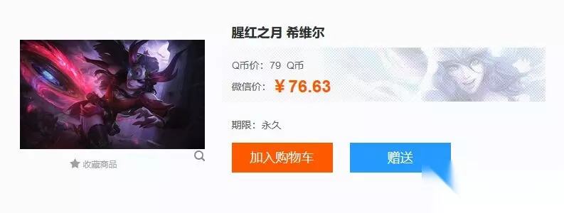 在游戏《英雄联盟》中,腥红之月希维尔的皮肤售价是79Q币,也可以使用微信进行支付。玩家在游戏商城或者官网的道聚城中搜索“腥红之月 希维尔”,找到对应的皮肤后直接购买或者加入购物车再结算都可以。