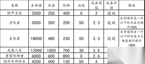 本图初始费用10,费用上限99,每秒回复1点。部署数量上限9,防御点生命2,共有敌人59人,包括寻仇者4人,轻甲卫兵33人,武装人员5人,重装防御者8人,复仇者2人,隐形术师组长7人。在(5,6)处为活性源石,经过的敌军在五分钟内每秒持续受到60伤害,攻击力提升50%,攻击速度提升50。 2、敌方基础数据