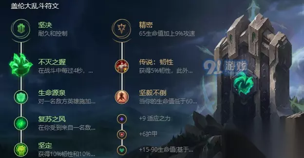 盖伦在游戏中是一个非常受到新手喜爱的英雄,技能简单是大家刚接触英雄联盟的一个新手英雄,这个英雄回复能力非常强在大乱斗这种地图中优势尤为明显,Q技能可以造成沉默大家可以来用打断一些比较有用的技能,大招高额的单体伤害可以快速击杀对方核心英雄。 英雄联盟S11大乱斗出装大全(点击进入) 2021英雄联盟S11英雄玩法出装大全(点击进入) S11大乱斗盖伦出装 出门装
