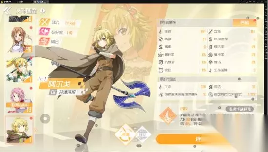 羁绊增益:生命,穿透,使用连携伤害加深提升,商店购买打折(珂尔)。 连携技能:对圆形区域内敌人造成伤害,并降低敌人移速。 推荐角色:后期所有输出 这是最后一个获得的伙伴,开启比较晚。后期必练。 伤害加深是独立计算的,穿透也是和破甲独立的一个属性。阿尔戈提供了更高的输出上限,追求极致输出还要靠阿尔戈。但由于开放比较晚,加上料理要求较高,培养难度还是很大的。 养成方面只加羁绊和等级,武器不要点,没有作用。 关于生活技能:商店购买打折意义不大,珂尔随处可刷。 后期进阶培养思路 这里提到的培养并不是看伤害和技能了,而是生活技能的提升。 幸和亚斯娜的生活技能是非常必要的,做药和做菜的活力消耗降低很必要。 后期在装备拉满技能卡拉满的情况下,药水和料理便是唯二的提升空间。短时强增益的作用很必要,一定要在前期就打好羁绊基础。 记得在刷本的时候多带上伙伴,快速提高好感度。 伙伴好感度培养顺序:亚斯娜>幸>桐人=莉法>莉兹贝特>阿尔戈;由于莉法太差,所以可以排外。