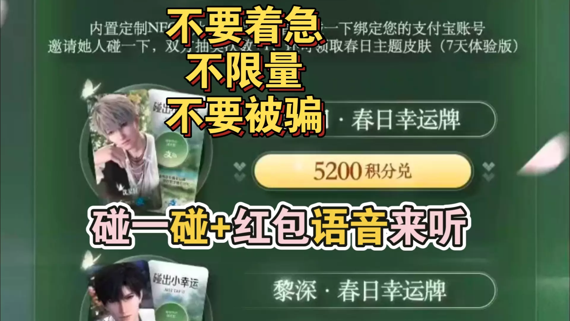这是《恋与深空》和支付宝会员的春季联动活动资讯,活动可做任务得抽奖机会,前5次必得语音红包,还能积分兑换,其中包含黎深春日限定语音红包封面,有玩家发现该红包封面的黎深声音存在问题。