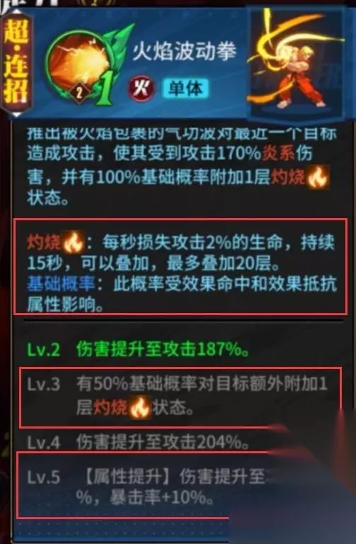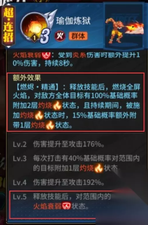 在打完一套以后,敌人身上有非常多的灼烧BUFF以后,第二套以红蛇超连3收尾,高额的燃爆伤害带走前排。