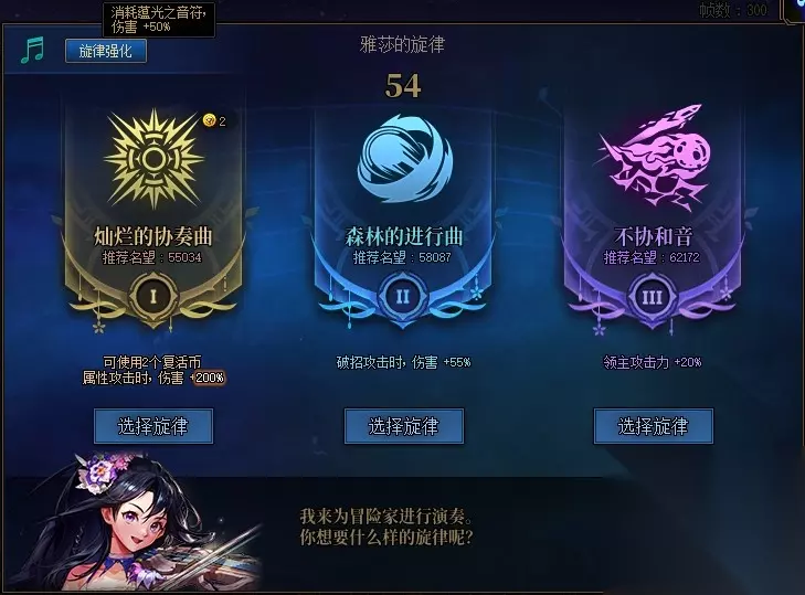 [各难度相关] 普通难度下,不同阶段都有不同入场效果,且可以消耗1个[蕴光之音符]获得本次所有战斗技能伤害+50%增益 不过该道具需要消耗[协调具现者之音]进行兑换,一般不推荐使用。