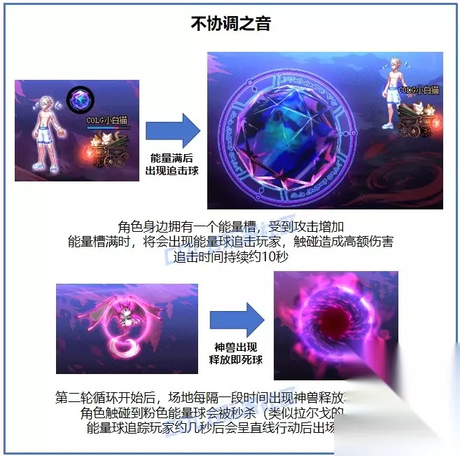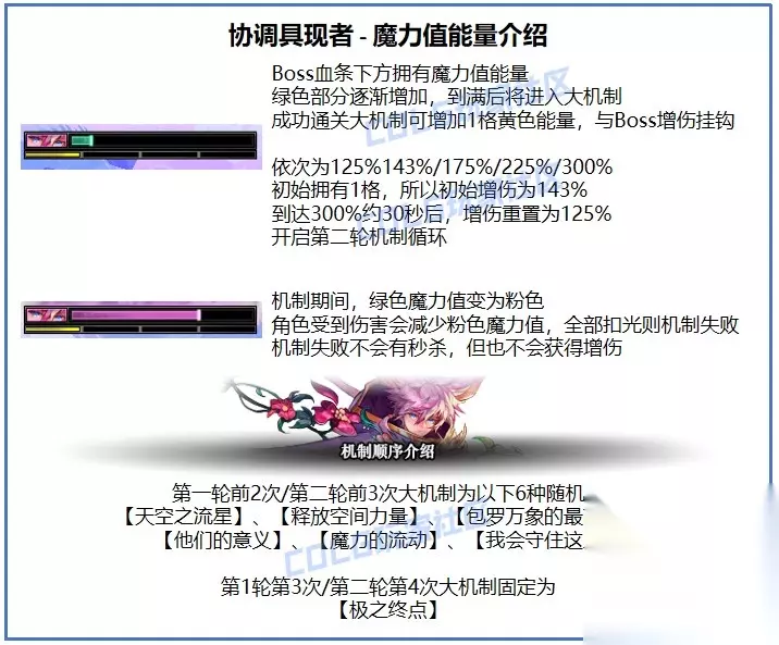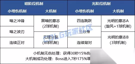 Boss的行动规律: Boss的行动相对规律,开场暗阶段,切屏后转化为光阶段 每个阶段的流程都是1个小增伤机制+1个大机制+切屏阶段,具体机制随机列表如图 增伤小机制无伤处理时,可以获得30秒的15%增伤;大机制处理失败则秒杀