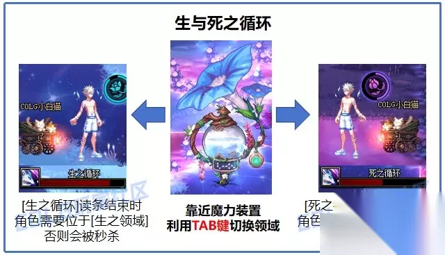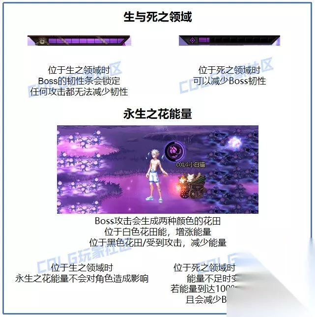 【攻略要点】 · 总体也没什么难度,存在部分秒杀机制,留意好当前状态即可 【机制介绍】 特殊机制:生与死之领域&永生之花能量条 作战场地分为[生之领域]与[死之领域],只有特殊机制下可以利用充能装置进行切换。