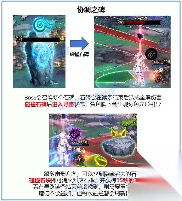 【攻略要点】 · Boss分为两个阶段,第一阶段血条清空后进入二阶段,血量表为两个阶段累积血量 · 总体难度较低,基本就是一路撞石头 【机制介绍】 核心机制:协调之碑 贯穿全程的机制,Boss的两个破防机制为限时内破坏4个和6个协调之碑 每次撞击石碑后,可前往魔力充能装置使用TAB减少Boss的5%韧性条