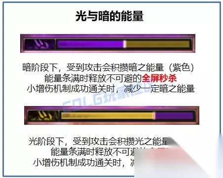 【攻略要点】 · 容错率较低,Boss招招致命有一种数值的美,掌握机制小心躲避 · 大多数强制执行的机制容错率较低,但可通过背板掌握 【机制介绍】 核心机制:光/暗能量 受到任意Boss的攻击,都会增涨能量条(大机制期间增涨更多) 能量条到达100%时,将会释放全屏秒杀机制,无法躲避
