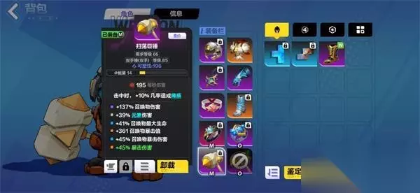 6.武器是前期的关键。后期一定是堆召唤物等级的,但前期帮助一般,且前期召唤物等级底子太贵。所以可以按我的这个武器去打造,买一个召唤物暴击值的底子去打造,以下词条均有用,暴击伤害可以通过附魔得到。注意不要学我,要把武器的能量re满。前期优先词条召唤物暴击,必须t1,其他找召唤物伤害,召唤物生命,召唤物爆击伤害。再次之元素伤害,范围伤害,暴击伤害,召唤物暴击%。