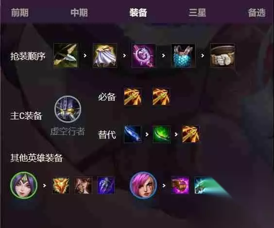 虚空行者(卡萨丁)出装推荐: 飓风+飓风+肃静/降星之刃 卡萨丁的核心装备是两件飓风,这能够充分利用他的被动技能,快速消耗敌方英雄法力值。第三件装备选择肃静或降星之刃,直接克制敌方关键技能,使其无法释放大招。 无需考虑狂暴之刃或疾射火炮等装备。 皮城执法官出装推荐: 珠光护手+海克斯科技枪刃+巨人捕手 皮城执法官是阵容的主力输出,装备选择应优先提升法术强度。珠光护手、海克斯科技枪刃和巨人捕手都是非常理想的选择,能显著增强其输出能力。 青丘狐狸出装推荐: 钢铁烈阳之盾+女妖之爪+女妖之爪/基克的先驱 青丘狐狸在阵容中担任辅助角色,因此装备应以辅助属性为主。钢铁烈阳之盾、女妖之爪以及基克的先驱都是不错的选择,切记不要给她堆叠法术装备。