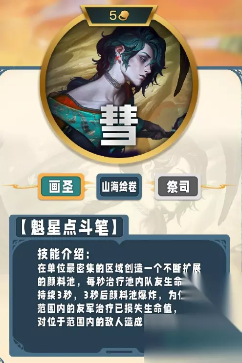 二、新增五费弈子:彗 羁绊:画圣、山海绘卷、祭司 技能介绍:魁星点斗笔 1、在玩家最密集的区域生成一个治疗队友的池子 2、3秒后池子爆炸治疗我方队友并对敌方目标造成魔法伤害