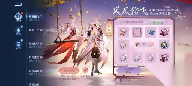 Q1:活动在哪里参与? A1:打开游戏,进入活动中心,点击凤凰偕飞-限定皮肤限时抽,即可找到活动。(活动通过逐步开放大区的形式上线,请还没有看到活动的召唤师耐心等待) Q2:祈福机会哪里来? A2:祈福机会即梧桐树枝,梧桐树枝可以在活动面板通过购买酷炫机甲(1日)获赠,同时激活“初夏超值福利卡活动”也可获赠梧桐树枝*1,相关活动详情点击 Q3:如何兑换凤求凰皮肤和凤凰于飞皮肤? A3:在凤凰偕飞活动中通过祈福获得凤凰令牌或者398数量的凤羽,就可以在兑换商店兑换限定皮肤,2个令牌可以兑换一个凤求凰皮肤,1个令牌可以兑换凤凰于飞皮肤; Q4:我运气很好,抽到了多余的凤凰令牌怎么用? A4:除了限定皮肤之外,凤凰令牌还可在兑换商店兑换凤凰偕飞特效大礼包或者皮肤碎片*88,同时自己抽到或者自己兑换的凤凰令牌也可以赠送给好友哦,赠送规则与游戏内赠礼一致;