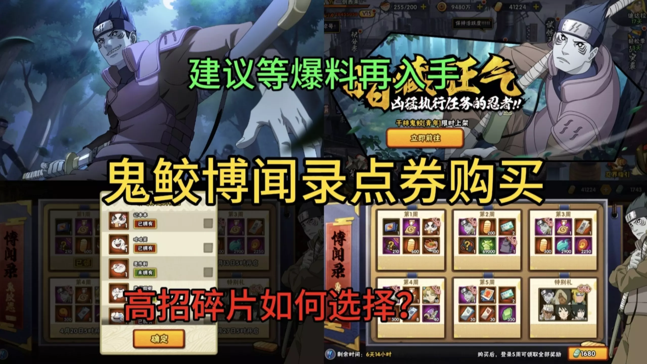 火影忍者手游开启博闻录鬼鲛卷,花费1680点券即可购买,购买后可获得干柿鬼鲛[青年]忍者、养成材料,还能自选表情,性价比不错。