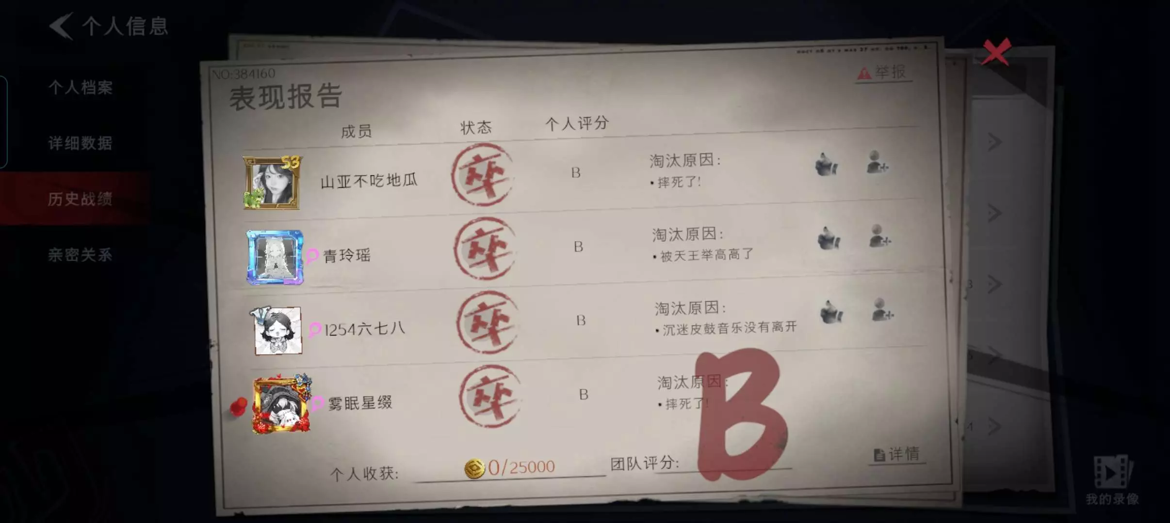 从刚进门就遇到蜘蛛开始情况变得不对劲了起来,先是每日遇见鬼新娘和皮鼓,后面出去的时候遇见地龙了当时外面还刷狼了,之后被举高高摔死了,我包里有除颤,队友出来救我但是主颤仪不知道到哪去了,然后就一直在找除颤,找到刷天王了,三个队友两个摔死,一个被吃了,当时金额已经够了然后我队友看我带的装备比较多然后再加上自己的装备带不出去,于是决定找除颤就造成了这个后果