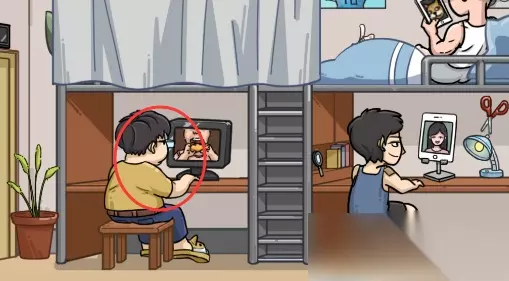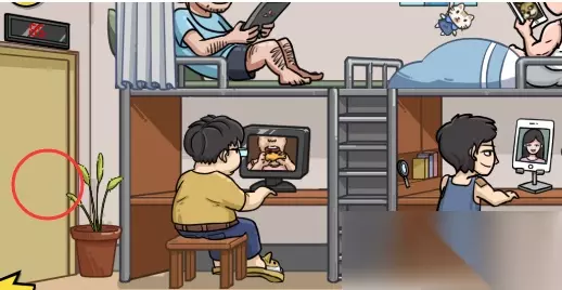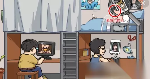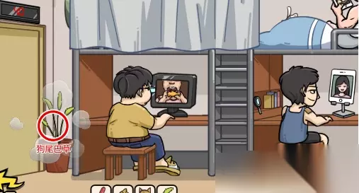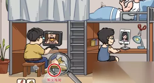 第二步:发现狗狗元素 使用放大镜,分别点击小胖的拖鞋和右上角的手机,获得“狗狗拖鞋”和“狗狗表情包”。