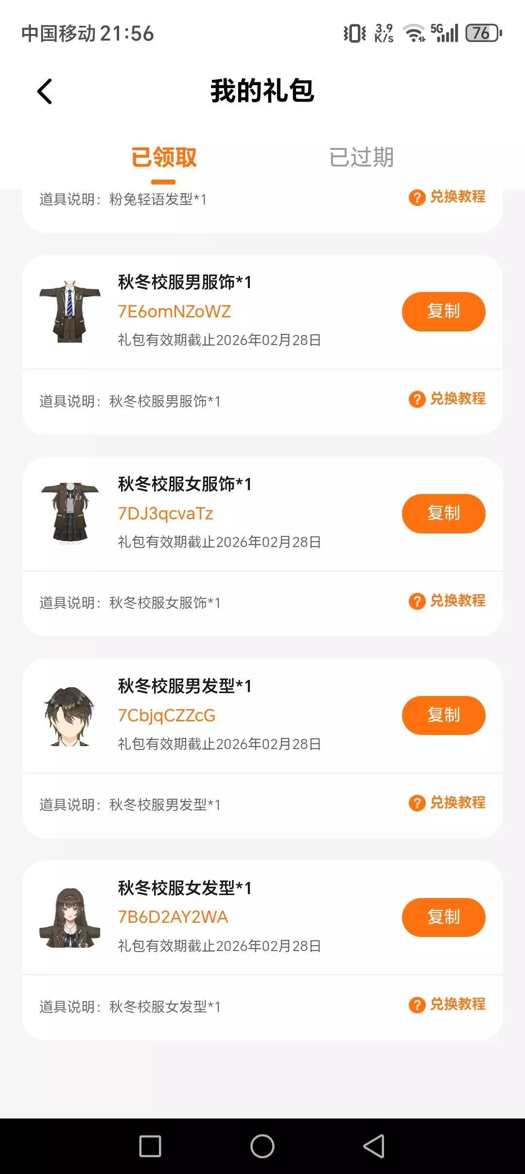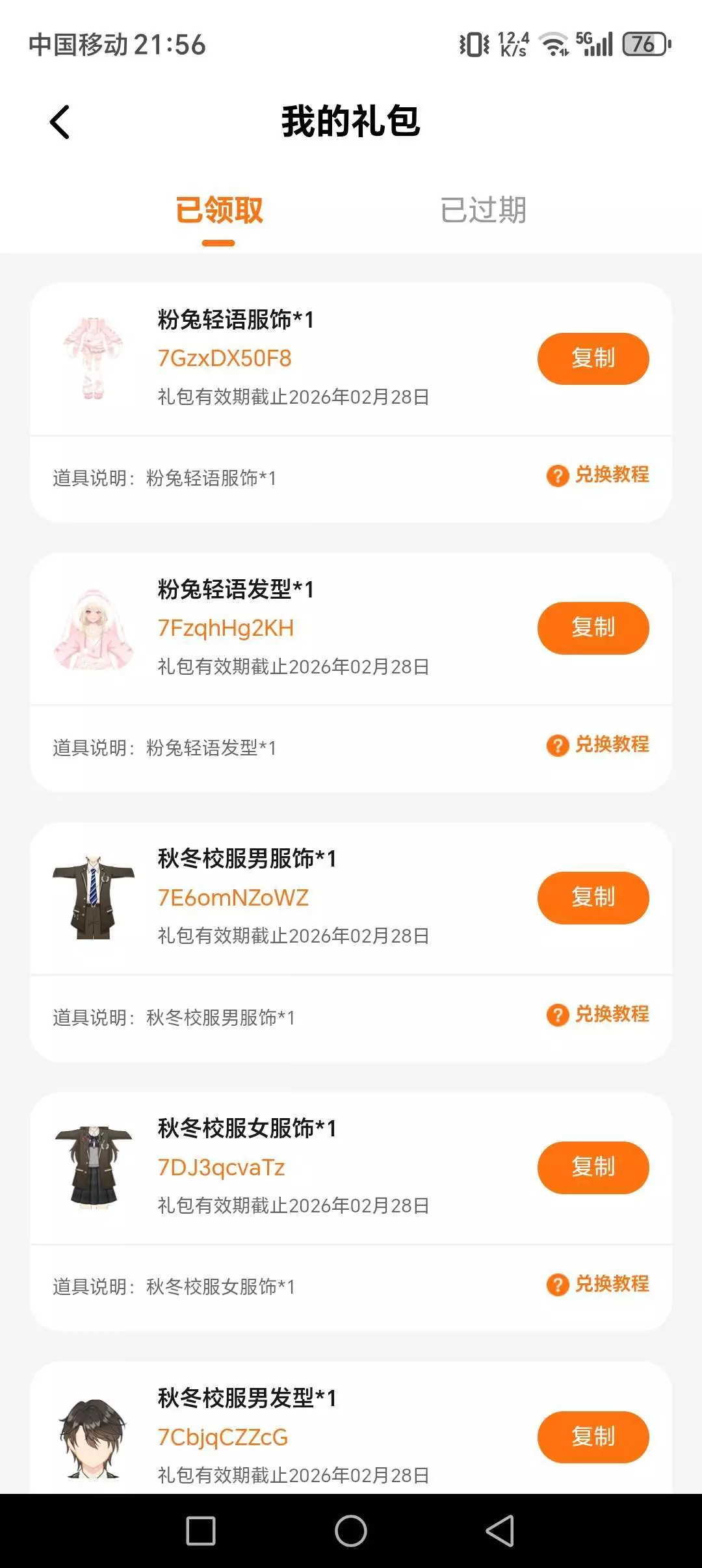 这是6个兑换码