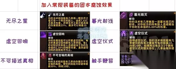 点击图片查看大图 最后我们说下加入常规装备的团本腐蚀效果。 新团本尼奥罗萨有一些特殊的腐蚀特效武器,这些腐蚀武器都很强大。三周前其中6种腐蚀效果加入了常规装备,也就是其他的装备在其他地方也可以拿到团本武器特效。 接下来我们按照类别聊聊。 无尽之星与触手鞭笞 这两个效果都是偏单体的腐蚀效果。 无尽之星原本是法系的,触手是物理系的,变成常规腐蚀词条后,无尽之星不管是法系还是物理都能触发,但是触手,用术士和法师测试都是不触发的。 无尽之星单体占比8%左右,触手单体4%左右,无尽之星要砸在同一个目标身上才叠伤害但是实测,有add的时候,它经常到处乱砸,伤害叠不起来。 所以纯单体无尽之星更强,触手在各种场景比较稳定,顺便提一下,这个触手吃兽王猎的精通加成。 暮光炮与虚空回响 这两个都是根据血量造成aoe伤害,暮光炮之前很强,目前砍了之后触发不稳定。 虚空回响目前ptr非常容易触发和叠加,伤害很变态。熊T带单个虚空回响,祖达萨4木桩可以扫到9w以上。如果不砍,那正式服绝对是近战无脑虚空回响A爆一切。也因为有暮光炮和虚空回响,熊T,DHT和DKT伤害很炸。 不可描述真相与虚空仪式 这两个都是属性提升,加快冷却回复速度,或者加绿字。 虚空仪式人越多覆盖率越高,现在一个人覆盖率25左右,不知道人多了覆盖率怎么样。 不可描述的真相,需要刷技能的职业可以带。