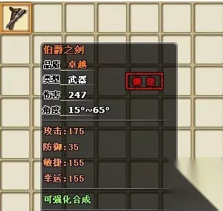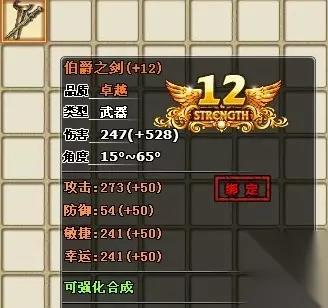 伯爵之剑资料: 外形:通体蜿蜒曲折,犹如灵蛇扭动般,经过不断升级,剑身会释放不同的光泽,昭示其逐步强大的威力。当它的威力提升到最高的时候,即便是高高在上的天使也要避开其锋芒,否则随时都有被拿来祭剑! 参数 伤害:247 角度:15°~65° 攻击:175 防御:35 敏捷:155 幸运:155