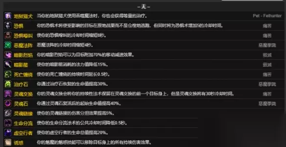 二、大型雕文 1、地狱猎犬 当你的地狱猎犬使用吞噬魔法时,你也会获得等量的治疗。 2、恐惧 你的恐惧术将使受影响的目标在原地战栗而不是仓惶地逃跑,但同时将为恐惧术增加5的冷却时间。 3、恐惧嚎叫 使你的恐惧嚎叫的冷却时间缩短8秒