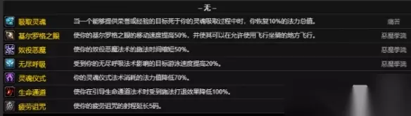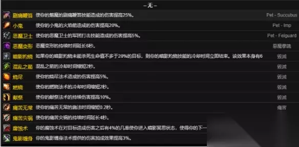 三、小型雕文 1、吸取灵魂 当一个能够提供荣誉或经验的目标死于你的灵魂吸取过程中时,你恢复10%的法力总值 2、基尔罗格之眼 使你的基尔罗格之眼的移动速度提高50%,并使其可以在允许使用飞行坐骑的地方飞行。 3、奴役恶魔 使你的奴役恶魔法术的施法时间缩短50%