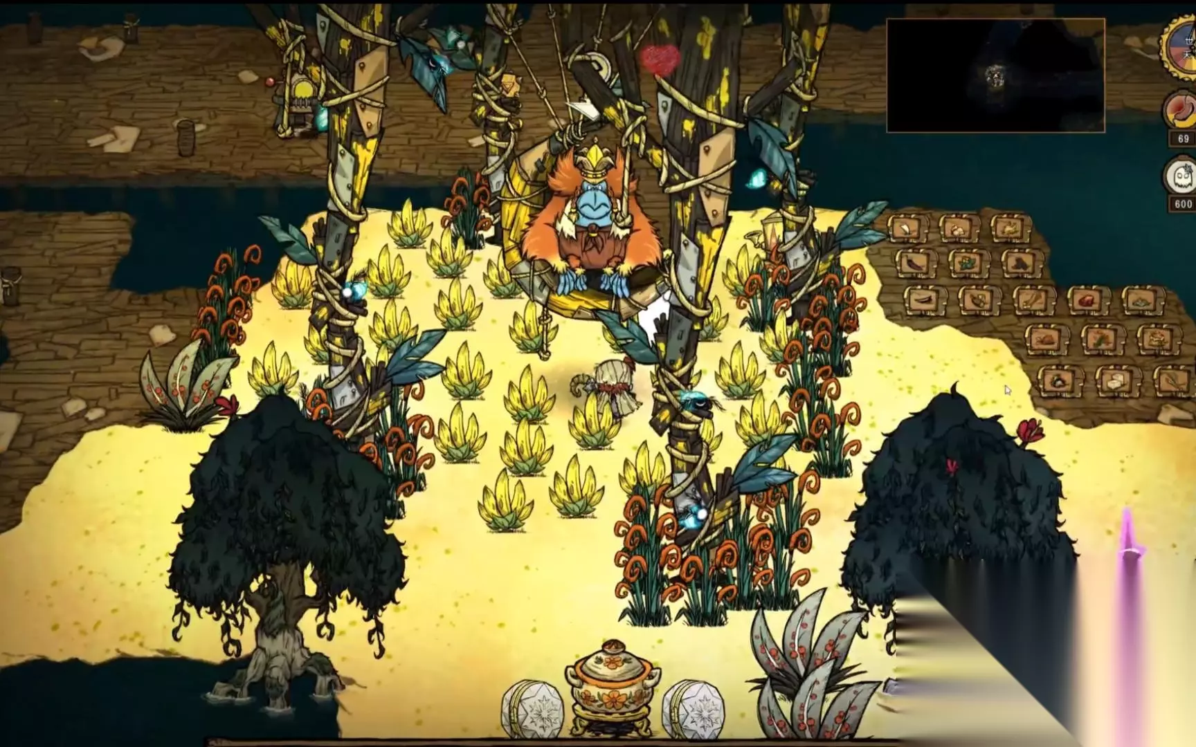 杀了它们还会掉落诅咒占格子,积累十个还会把我们也变成猴子。首先我们需要知道猴子的行为逻辑,它们会优先寻找并捡附近地上的东西,如果没有可以捡的东西,则会尝试抢东西。这就有点类似防止火鸡摘浆果的逻辑了,把任意一个物品放地上围起来,猴子捡不起来就会被一直卡在这。