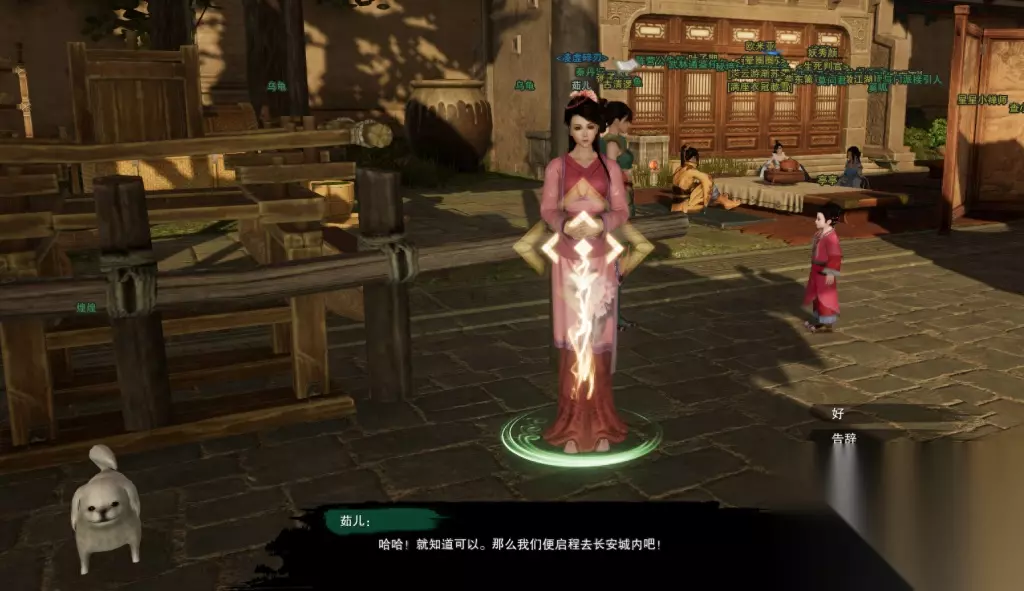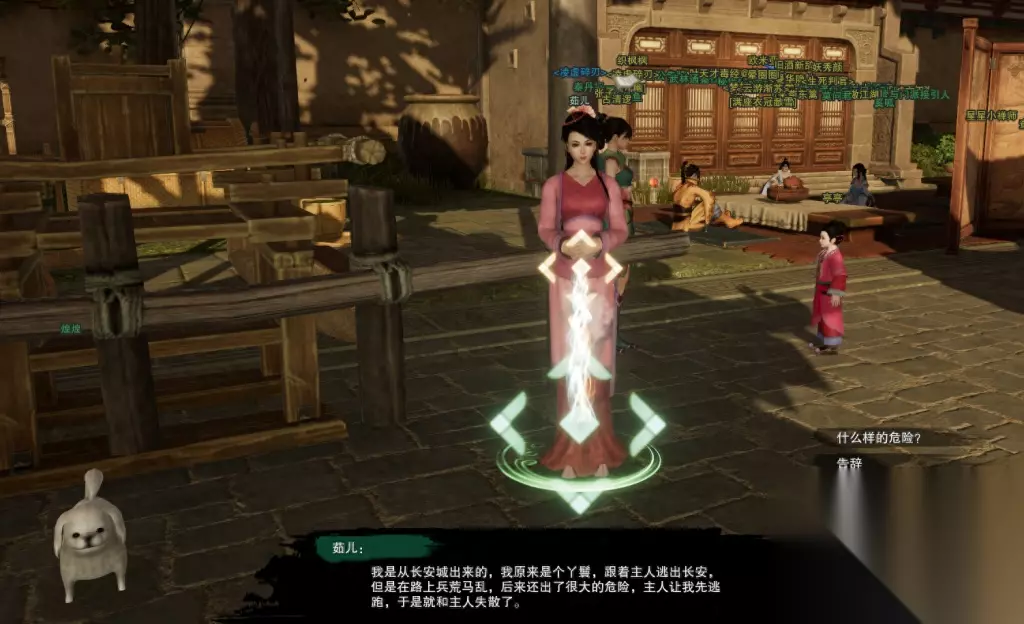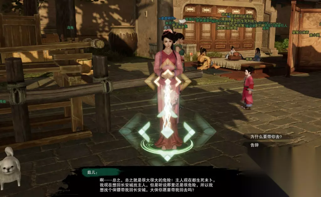 【茹儿】就在长安落地点车夫旁边,点她对话,她会告诉你小狗狗【煌煌】好像没有跟过来,拜托你帮忙找一下。
