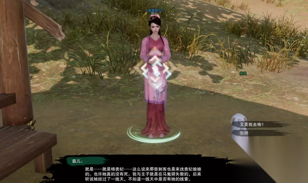 她希望我们好好照顾【煌煌】,也希望如果能再次遇见杨贵妃,为她带一句话。 接着原地点击【茹儿】对话,将她埋葬。