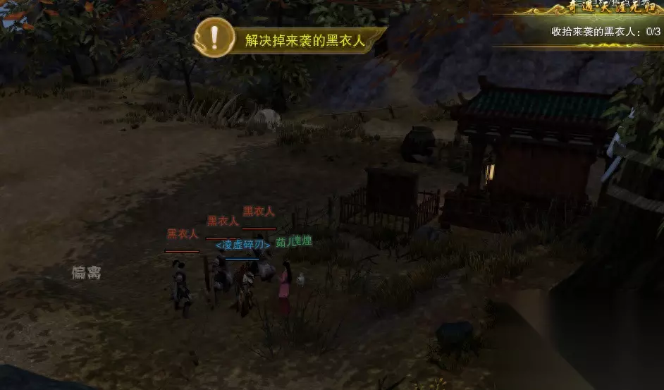 落地之后点选【茹儿】对话,马上又要打三个黑衣人(是的没完没了了)。