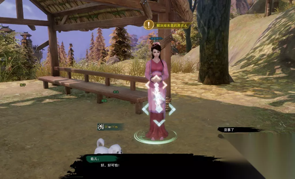 解决黑衣人,再和【茹儿】对话,得知这些黑衣人应该是想利用煌煌去找杨贵妃。她拜托我们找到黄色的染料,把小白狗染色,躲避追查。 在【直西岛】这个位置捡到3根【黄雪草】,再回去找【茹儿】对话。