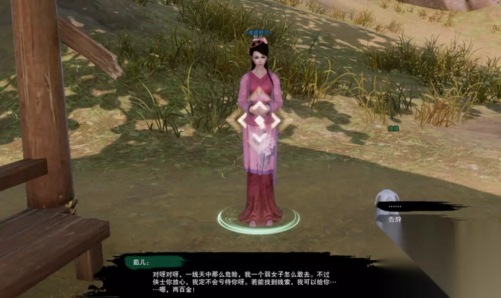 找到之后和她对话,她会告诉你需要帮忙送去长安,而且会给你一百金当作报酬! 在送到长安之后你就会得到这一百金巨款了。 对话结束,奇遇状态一跳,就可以直飞长安城。